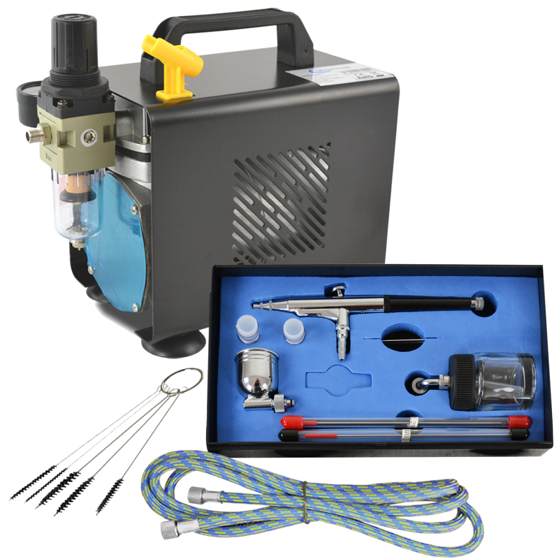 Dieser öl- und wartungsfreie Airbrush Kompressor ist für Arbeiten mit allen handelsüblichen Airbrushfarben geeignet. Mit nur 47dB ermöglicht er angenehmes Arbeiten auch in kleineren, geschlossenen Räumen. Sein kompaktes Design und der integrierte Tragegriff erleichtern den mobilen Einsatz. Die Abschaltautomatik ermöglicht einen stromsparenden Betrieb.