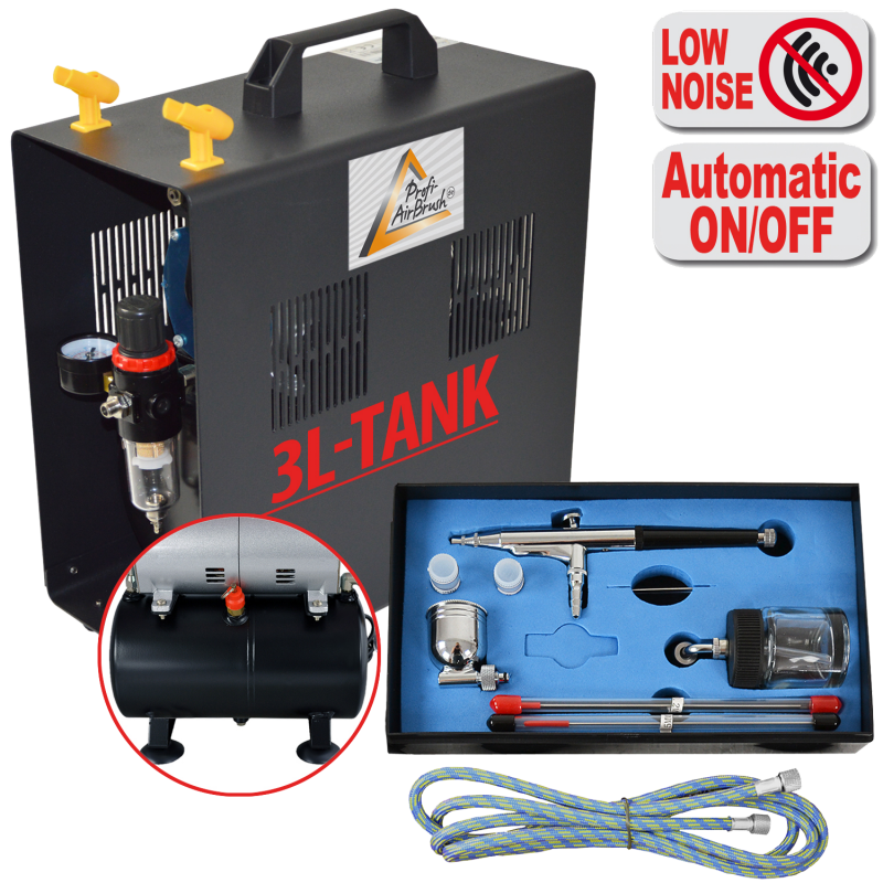 Der energieeffiziente Einzel-Zylinder-Kompressor mit Schutzgehäuse ist mit einem integrierten 3-Liter-Lufttank, einem Wasserabschneider, einem integrierten Durchfluss- und Druckregler und einem Manometer ausgestattet. Die Druckluftreserve des Tanks ermöglicht perfektes Airbrushing bei gleichbleibendem Arbeitsdruck.